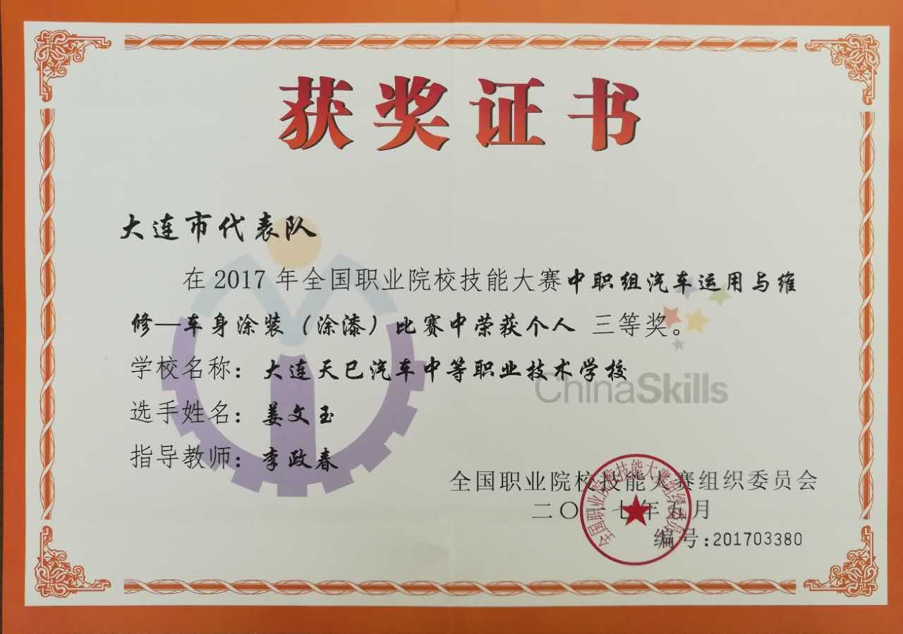 日前,由教育部、交通运输部、天津市人民政府联合主办的2017年全国职业院校技能大赛汽车运用与维修赛项(中职组)在天津进行为期三天的比赛,来自全国各职业院校的近四百名选手参加了本次大赛。我校156班学生姜文玉代表大连市中等职业学校参赛,在车身涂装(涂漆)子赛项中荣获三等奖。